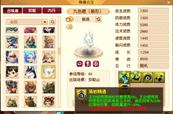 九色鹿兽型,资质成长无亮点,必带技能落岩精通。