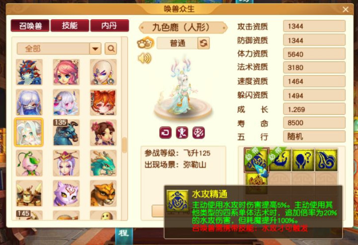 九色鹿人形,资质成长甚至可以说很垃圾,必带水攻精通,天生还有迟钝。