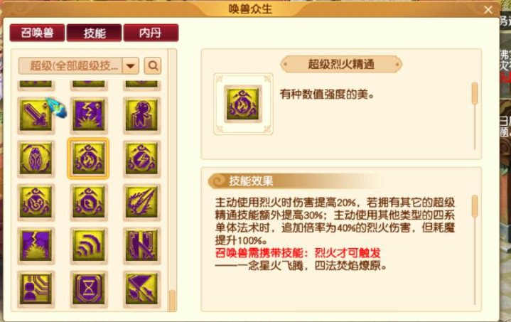 主动使用伤害提高20%,若拥有其他超级精通技能,额外提高30%,主动使用其他四系后追加的是40%。