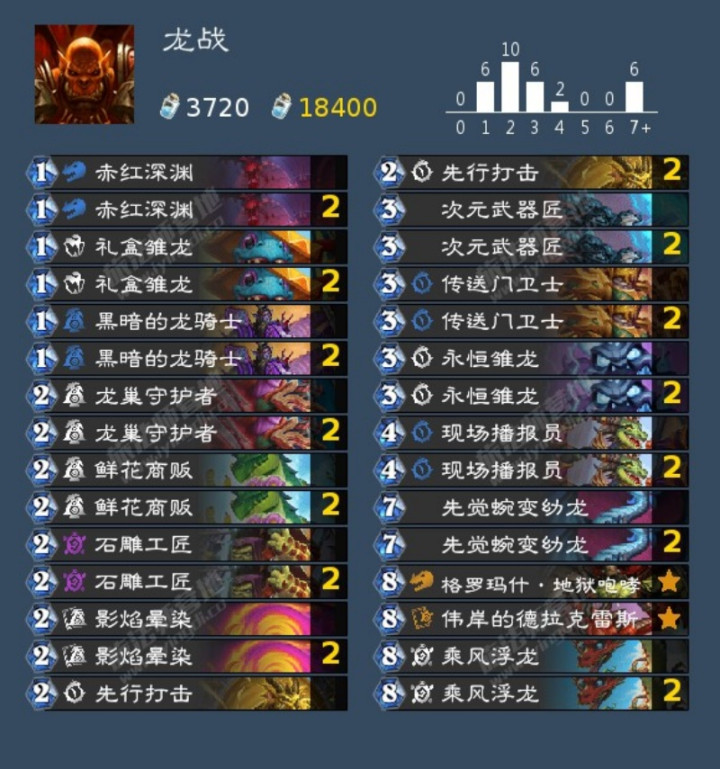 得到迷你包补强后的龙战现在胡起来感觉更加猛了,3费拍次元武器匠给手牌加攻,4费拍下769扰魔的先觉蜿变幼龙,5费触发延系拍下8费6/6打5叠5甲的乘风浮龙,每一回合都是节奏上的大压制,因此包括龙战自己在内很多卡组都带上了永恒雏龙,来应对4费准时拍6/9扰魔的这一波节奏,这波看来是永恒龙军团赢了。不过龙战如果牌序不好的话,没打出应有的节奏也更不容易把节奏扳回来,好处是效率比较高,而且打起来不太费脑子。