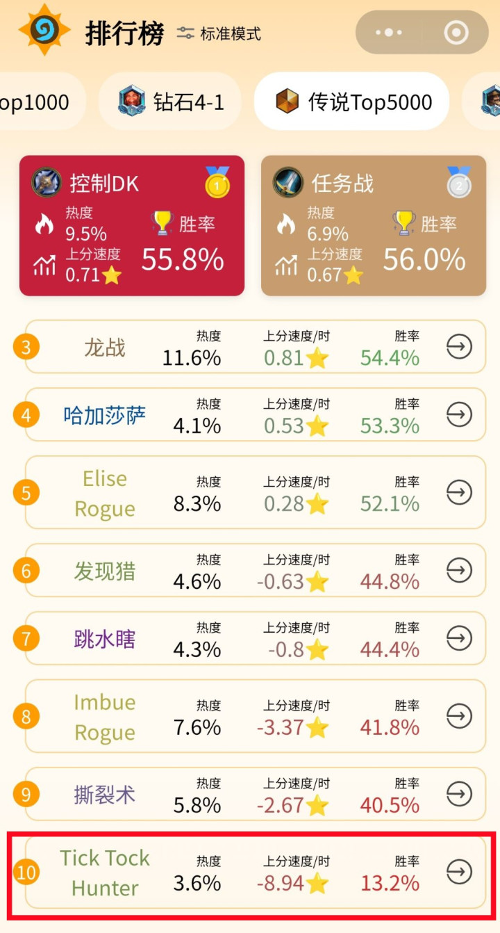清风尝试了几次,甚至差点没打过脚本,经常是一通操作猛如虎,拍完提克托克然后点投降。几局体验下来感觉不能把任务当做绝对核心,前期强行做任务太亏节奏了,但是问题是不把任务当做核心,当做体系单挂的话做起来又太慢了,而且做完之后也没有特别厉害。最幽默的是,昨天下午任务猎大数据的胜率甚至一度跌到13%,属实离谱。不过值得一提的是,设计师蓝贴已经确认情势反转不能做任务是属于bug了,在未来的补丁里会进行修复,这样术士单挂任务只需要一张2费法术,或者带芬利和提灯就能直接做完任务,说不定术士拿来单挂效果更好,这就得等bug修复之后再看了,当然这是狂野模式的事了。