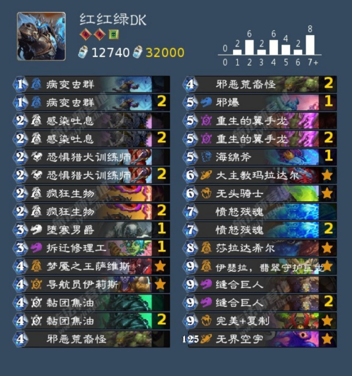 迷你包队DK主要的补强是邪恶荒裔怪和愤怒残魂,邪恶荒裔怪让DK的海绵斧变得更猛了,直接从5攻变成9攻大刀,另外清风还看到过有些DK还会带上末日使者之杖,3费挂上,4费拍邪恶荒裔怪,亡语全涂到末日使者之杖上就变成5攻6耐的武器了,也挺厉害的,而愤怒残魂就是DK最想要的优质过牌了,另外旧时回响其实也挺不错,5费如果能准时出三个四费怪还挺猛的。另外现在的DK形态也有很多种,比如偏控制的红红绿DK,带法瑞克更偏节奏一点的绿绿红DK,更偏进攻的蓝蓝绿冰DK,这几套都挺厉害的,不过现在热度最高的应该还是红红绿DK。